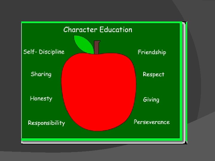 Kelas demokrasi Kerjasama dan kolaborasi Fokus dalam memecahkan masalah Perkembangan hubungan antara siswa, guru, dan masyarakat Masyarakat peserta didik yang peduli IMPLEMENTA SI PENDIDIKAN KARAKTER Pembelajaran emosional dan sosial Keadilan, rasa hormat, dan kejujuran Kesempatan mempraktekkan prilaku moralnya