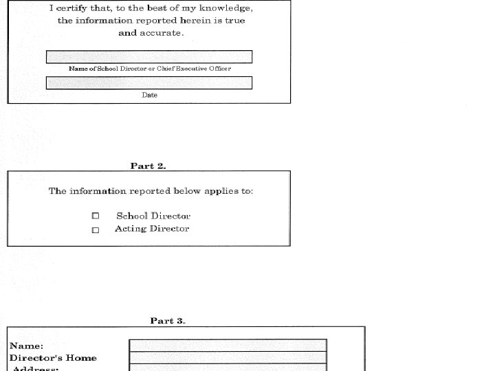 Site Visits • • Expansion of instructional space Remote location Branch location Relocation – – All requested in writing by school - $500 fee All require Certificate of Occupancy Bond rider All require Board approval • Compliance Visit – Scheduled by staff, no fee