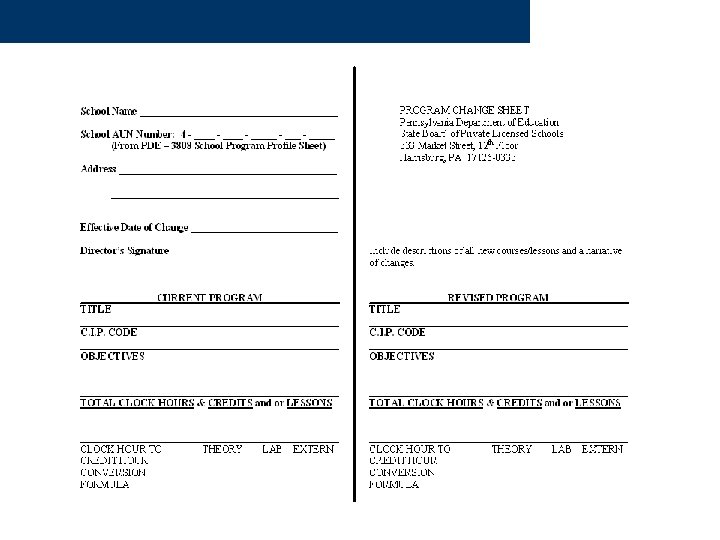 Program Changes • Submitted on PDE-3744 • Must be less than 25% change in clock hours • Cannot be a substantive change to objectives • Approval required PRIOR to implementation • Also required for tuition changes