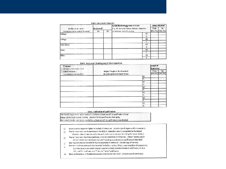Instructors’ Qualifications PDE-279 Forms • Do not submit these forms unless requested. • One completed PDE-279 form and the supporting documentation must be on file for each instructor. • Files may be paper or electronic, but must be produced upon request at compliance visits.