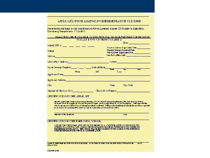 Admission Representatives • Required if students will be asked to sign enrollment agreement anyplace off the school property • Not required for marketing – education fairs, etc. – if students do not enroll • PDE-5006 • $300 Fee • Must be renewed annually