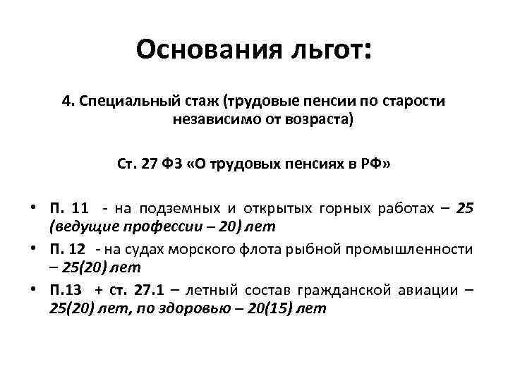 Основания льгот: 4. Специальный стаж (трудовые пенсии по старости независимо от возраста) Ст. 27 ФЗ «О трудовых пенсиях в РФ» • П. 11 - на подземных и открытых горных работах – 25 (ведущие профессии – 20) лет • П. 12 - на судах морского флота рыбной промышленности – 25(20) лет • П. 13 + ст. 27. 1 – летный состав гражданской авиации – 25(20) лет, по здоровью – 20(15) лет