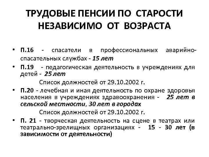 ТРУДОВЫЕ ПЕНСИИ ПО СТАРОСТИ НЕЗАВИСИМО ОТ ВОЗРАСТА • П. 16 - спасатели в профессиональных аварийноспасательных службах - 15 лет • П. 19 - педагогическая деятельность в учреждениях для детей - 25 лет Список должностей от 29. 10. 2002 г. • П. 20 - лечебная и иная деятельность по охране здоровья населения в учреждениях здравоохранения - 25 лет в сельской местности, 30 лет в городах Список должностей от 29. 10. 2002 г. • П. 21 - творческая деятельность на сцене в театрах или театрально-зрелищных организациях - 15 - 30 лет (в зависимости от деятельности)