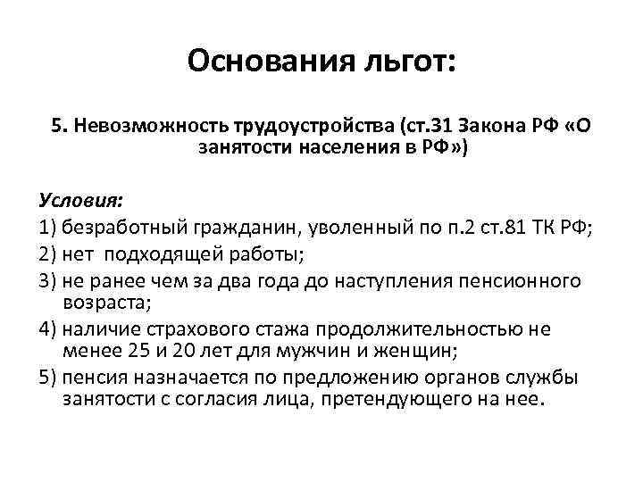 Основания льгот: 5. Невозможность трудоустройства (ст. 31 Закона РФ «О занятости населения в РФ» ) Условия: 1) безработный гражданин, уволенный по п. 2 ст. 81 ТК РФ; 2) нет подходящей работы; 3) не ранее чем за два года до наступления пенсионного возраста; 4) наличие страхового стажа продолжительностью не менее 25 и 20 лет для мужчин и женщин; 5) пенсия назначается по предложению органов службы занятости с согласия лица, претендующего на нее.