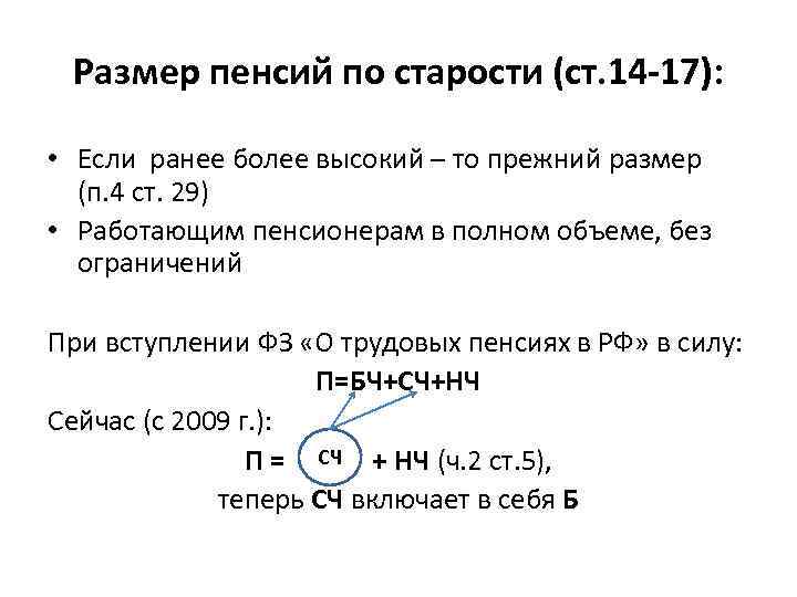 Размер пенсий по старости (ст. 14 -17): • Если ранее более высокий – то прежний размер (п. 4 ст. 29) • Работающим пенсионерам в полном объеме, без ограничений При вступлении ФЗ «О трудовых пенсиях в РФ» в силу: П=БЧ+СЧ+НЧ Сейчас (с 2009 г. ): СЧ П = + НЧ (ч. 2 ст. 5), теперь СЧ включает в себя Б