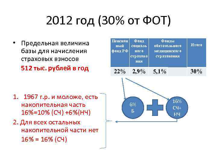 2012 год (30% от ФОТ) • Предельная величина базы для начисления страховых взносов 512 тыс. рублей в год 1. 1967 г. р. и моложе, есть накопительная часть 16%=10% (СЧ) +6%(НЧ) 2. Для всех остальных накопительной части нет 16% = 16% (СЧ) Пенсион Фонд ный социаль фонд РФ ного страхова ния 22% 2, 9% 6% Б Фонды обязательного медицинского страхования 5, 1% Итого 30% 16% СЧ+ НЧ