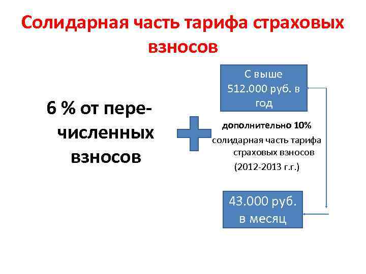 Солидарная часть тарифа страховых взносов 6 % от перечисленных взносов С выше 512. 000 руб. в год дополнительно 10% солидарная часть тарифа страховых взносов (2012 -2013 г. г. ) 43. 000 руб. в месяц