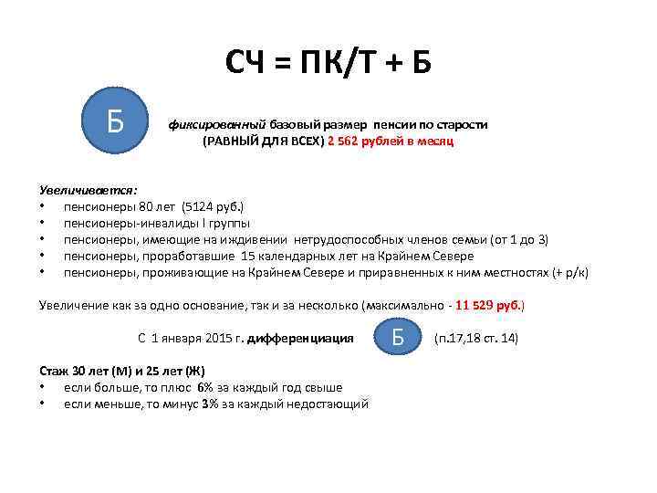 СЧ = ПК/Т + Б Б фиксированный базовый размер пенсии по старости (РАВНЫЙ ДЛЯ ВСЕХ) 2 562 рублей в месяц Увеличивается: • пенсионеры 80 лет (5124 руб. ) • пенсионеры-инвалиды I группы • пенсионеры, имеющие на иждивении нетрудоспособных членов семьи (от 1 до 3) • пенсионеры, проработавшие 15 календарных лет на Крайнем Севере • пенсионеры, проживающие на Крайнем Севере и приравненных к ним местностях (+ р/к) Увеличение как за одно основание, так и за несколько (максимально - 11 529 руб. ) С 1 января 2015 г. дифференциация (п. 17, 18 ст. 14) Б Стаж 30 лет (М) и 25 лет (Ж) • если больше, то плюс 6% за каждый год свыше • если меньше, то минус 3% за каждый недостающий