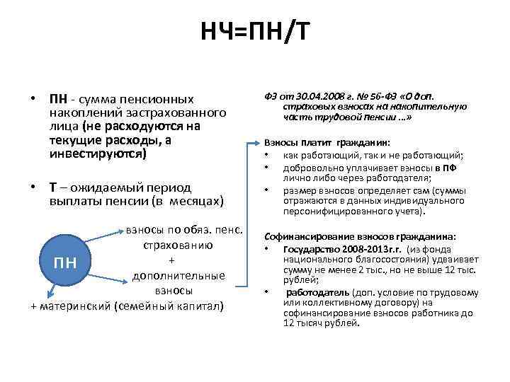 НЧ=ПН/Т • ПН - сумма пенсионных накоплений застрахованного лица (не расходуются на текущие расходы, а инвестируются) • Т – ожидаемый период выплаты пенсии (в месяцах) взносы по обяз. пенс. страхованию + дополнительные взносы + материнский (семейный капитал) пн ФЗ от 30. 04. 2008 г. № 56 -ФЗ «О доп. страховых взносах на накопительную часть трудовой пенсии …» Взносы платит гражданин: • как работающий, так и не работающий; • добровольно уплачивает взносы в ПФ лично либо через работодателя; • размер взносов определяет сам (суммы отражаются в данных индивидуального персонифицированного учета). Софинансирование взносов гражданина: • Государство 2008 -2013 г. г. (из фонда национального благосостояния) удваивает сумму не менее 2 тыс. , но не выше 12 тыс. рублей; • работодатель (доп. условие по трудовому или коллективному договору) на софинансирование взносов работника до 12 тысяч рублей.