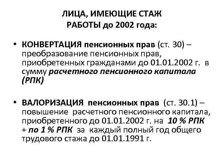 ЛИЦА, ИМЕЮЩИЕ СТАЖ РАБОТЫ до 2002 года: • КОНВЕРТАЦИЯ пенсионных прав (ст. 30) – преобразование пенсионных прав, приобретенных гражданами до 01. 2002 г. в сумму расчетного пенсионного капитала (РПК) • ВАЛОРИЗАЦИЯ пенсионных прав (ст. 30. 1) – повышение расчетного пенсионного капитала, приобретенного до 01. 2002 г. на 10 % РПК + по 1 % РПК за каждый полный год общего трудового стажа до 01. 1991 г.
