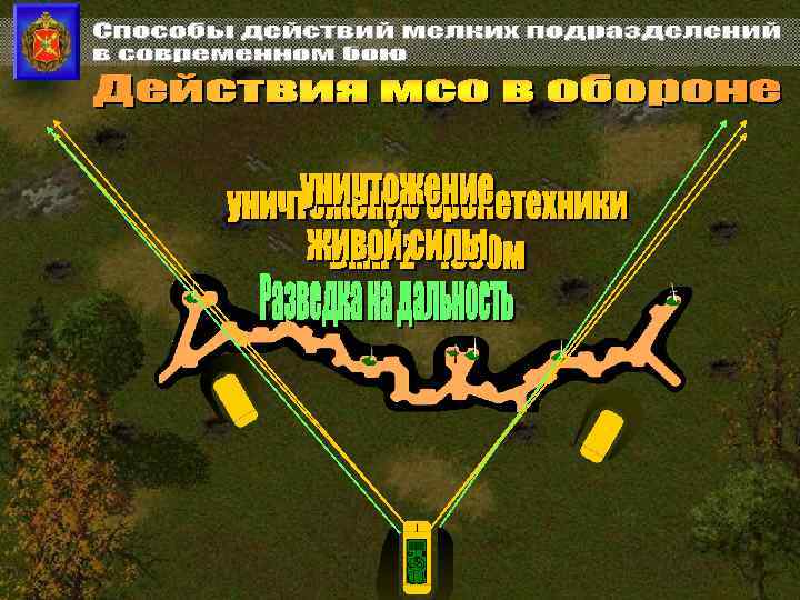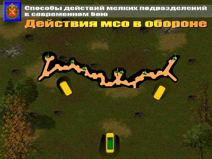 Мотострелковое отделение в обороне В опорном пункте взвода отделение может оборонять позицию, находясь в центре, на правом или левом фланге. Промежутки между отделениями могут быть до 50 м. На позиции отделение (личный состав) размещается так, чтобы между солдатами были интервалы до 15 м. Командир отделения обычно находится на позиции в таком месте, откуда удобнее управлять отделением, наблюдать за местностью и за сигналами командира взвода. Как правило, командир отделения располагается в центре позиции, с ним рядом находятся пулеметчик и гранатометчик.