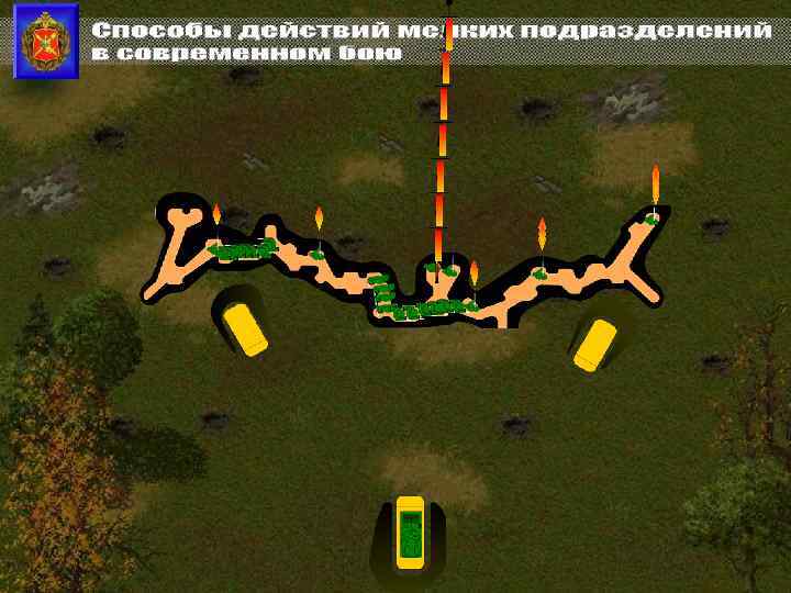 Уничтожение противника в глубине его обороны огнем всех средств и решительной атакой с фронта Приблизившись к переднему краю обороны противника на 25— 30 м, отделение по команде “Гранатами — огонь” забрасывает траншею противника ручными гранатами и с криком “УРА!” вслед за танком стремительно врывается на позицию противника, уничтожает его огневые средства и живую силу. БМП (БТР), продвигаясь за своим отделением от укрытия к укрытию, поддерживает отделение огнем.