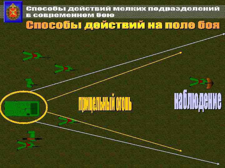 Боевая задача отделения (танка) в наступлении. Отделению (танку) в наступлении указываются объект атаки и направление дальнейшего наступления. Иногда, особенно при постановке боевой задачи по радио, отделению может быть указано только направление атаки. Исходя из боевых возможностей отделения объектом атаки является противник в окопах или других фортификационных сооружениях опорного пункта, а также отдельно расположенные на направлении наступления танки, орудия, пулеметы и другие огневые средства противника. Направление дальнейшего наступления мотострелкового отделения определяется с таким расчетом, чтобы обеспечивалось выполнение задачи взвода.