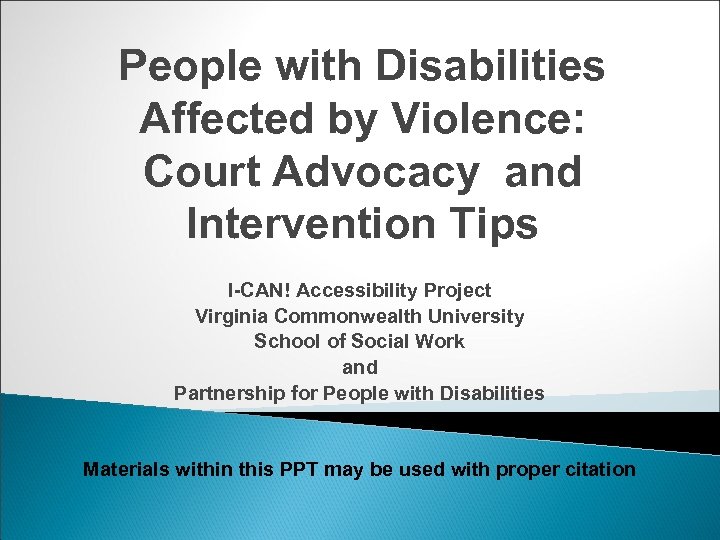 People with Disabilities Affected by Violence: Court Advocacy and Intervention Tips I-CAN! Accessibility Project Virginia Commonwealth University School of Social Work and Partnership for People with Disabilities Materials within this PPT may be used with proper citation