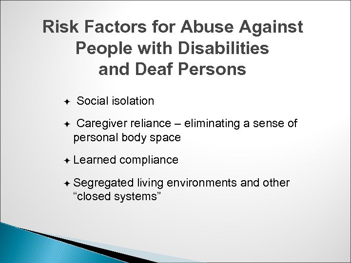 Risk Factors for Abuse Against People with Disabilities and Deaf Persons Social isolation Caregiver reliance – eliminating a sense of personal body space Learned compliance Segregated living environments and other “closed systems”
