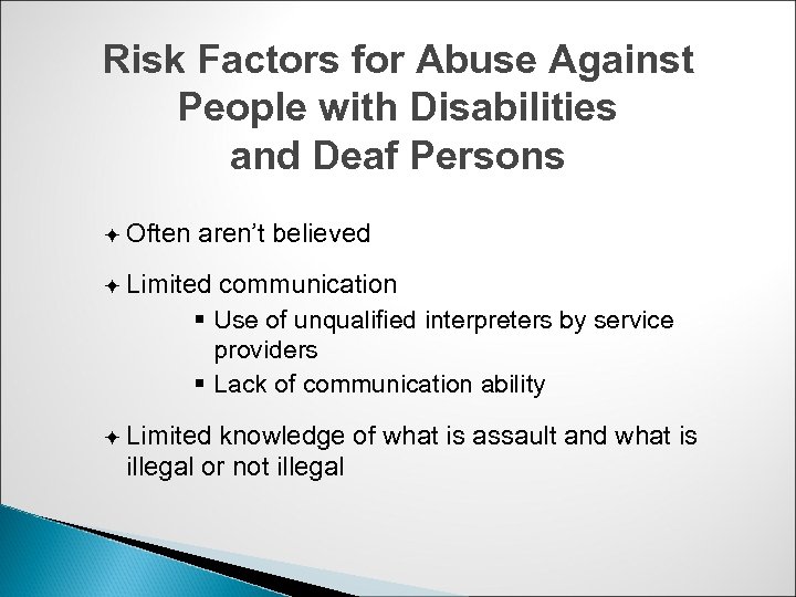 Risk Factors for Abuse Against People with Disabilities and Deaf Persons Often aren’t believed Limited communication § Use of unqualified interpreters by service providers § Lack of communication ability Limited knowledge of what is assault and what is illegal or not illegal