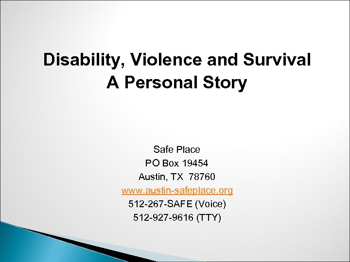 Disability, Violence and Survival A Personal Story Safe Place PO Box 19454 Austin, TX 78760 www. austin-safeplace. org 512 -267 -SAFE (Voice) 512 -927 -9616 (TTY)