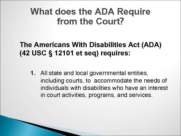 What does the ADA Require from the Court? The Americans With Disabilities Act (ADA) (42 USC § 12101 et seq) requires: 1. All state and local governmental entities, including courts, to accommodate the needs of individuals with disabilities who have an interest in court activities, programs, and services.