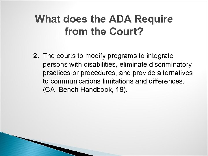 What does the ADA Require from the Court? 2. The courts to modify programs to integrate persons with disabilities, eliminate discriminatory practices or procedures, and provide alternatives to communications limitations and differences. (CA Bench Handbook, 18).