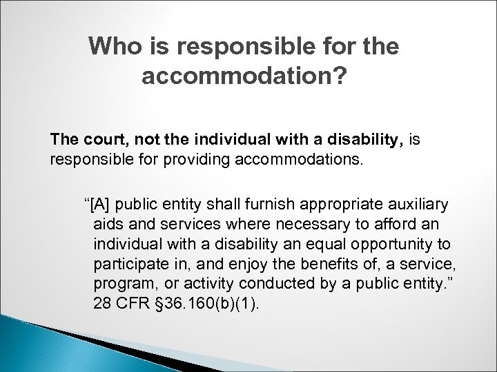 Who is responsible for the accommodation? The court, not the individual with a disability, is responsible for providing accommodations. “[A] public entity shall furnish appropriate auxiliary aids and services where necessary to afford an individual with a disability an equal opportunity to participate in, and enjoy the benefits of, a service, program, or activity conducted by a public entity. ” 28 CFR § 36. 160(b)(1).