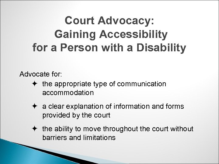 Court Advocacy: Gaining Accessibility for a Person with a Disability Advocate for: the appropriate type of communication accommodation a clear explanation of information and forms provided by the court the ability to move throughout the court without barriers and limitations