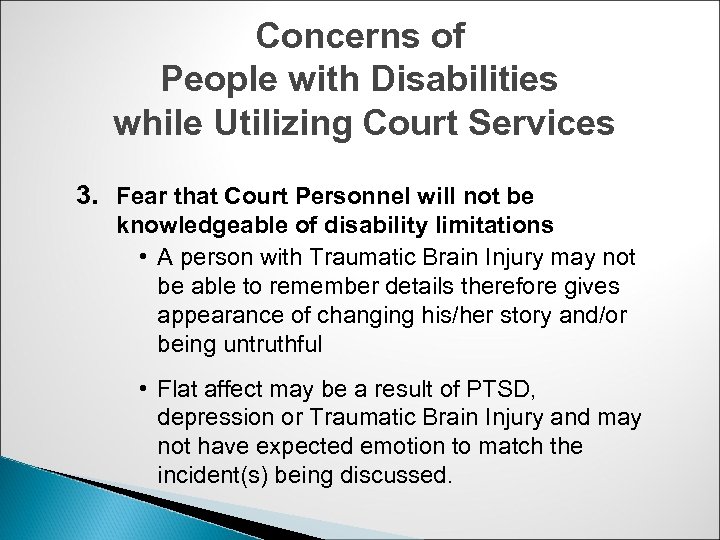 Concerns of People with Disabilities while Utilizing Court Services 3. Fear that Court Personnel will not be knowledgeable of disability limitations • A person with Traumatic Brain Injury may not be able to remember details therefore gives appearance of changing his/her story and/or being untruthful • Flat affect may be a result of PTSD, depression or Traumatic Brain Injury and may not have expected emotion to match the incident(s) being discussed.
