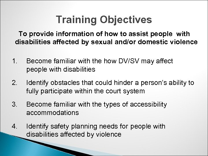 Training Objectives To provide information of how to assist people with disabilities affected by sexual and/or domestic violence 1. Become familiar with the how DV/SV may affect people with disabilities 2. Identify obstacles that could hinder a person’s ability to fully participate within the court system 3. Become familiar with the types of accessibility accommodations 4. Identify safety planning needs for people with disabilities affected by violence