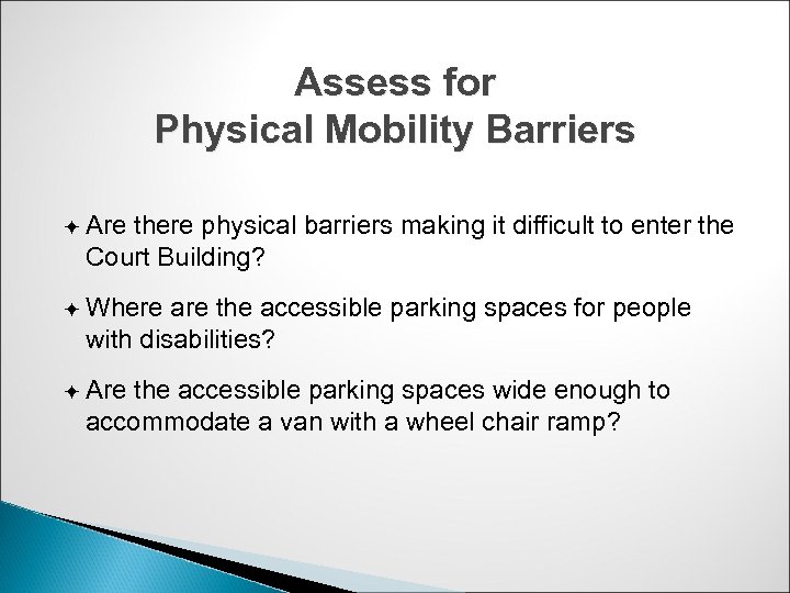 Assess for Physical Mobility Barriers Are there physical barriers making it difficult to enter the Court Building? Where are the accessible parking spaces for people with disabilities? Are the accessible parking spaces wide enough to accommodate a van with a wheel chair ramp?
