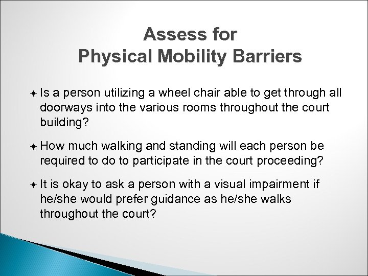 Assess for Physical Mobility Barriers Is a person utilizing a wheel chair able to get through all doorways into the various rooms throughout the court building? How much walking and standing will each person be required to do to participate in the court proceeding? It is okay to ask a person with a visual impairment if he/she would prefer guidance as he/she walks throughout the court?