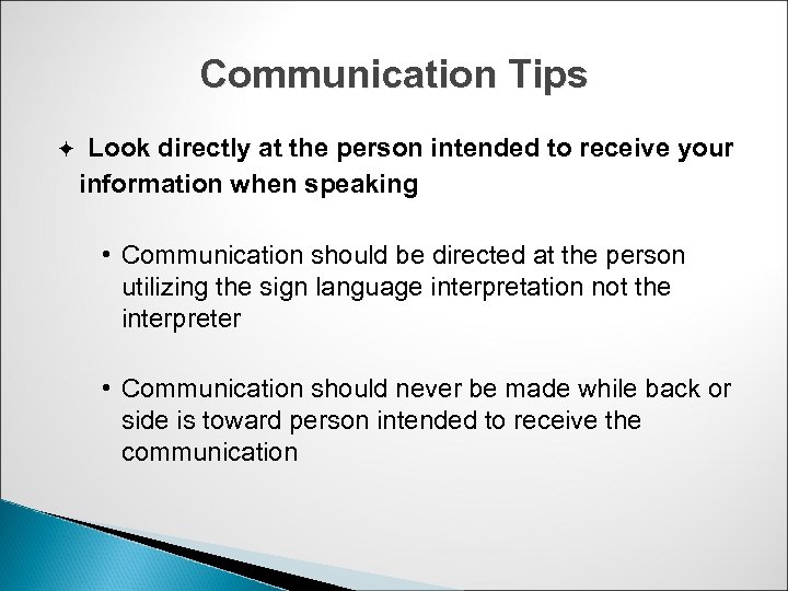 Communication Tips Look directly at the person intended to receive your information when speaking • Communication should be directed at the person utilizing the sign language interpretation not the interpreter • Communication should never be made while back or side is toward person intended to receive the communication