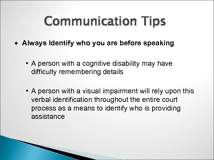Communication Tips Always Identify who you are before speaking • A person with a cognitive disability may have difficulty remembering details • A person with a visual impairment will rely upon this verbal identification throughout the entire court process as a means to identify who is providing assistance