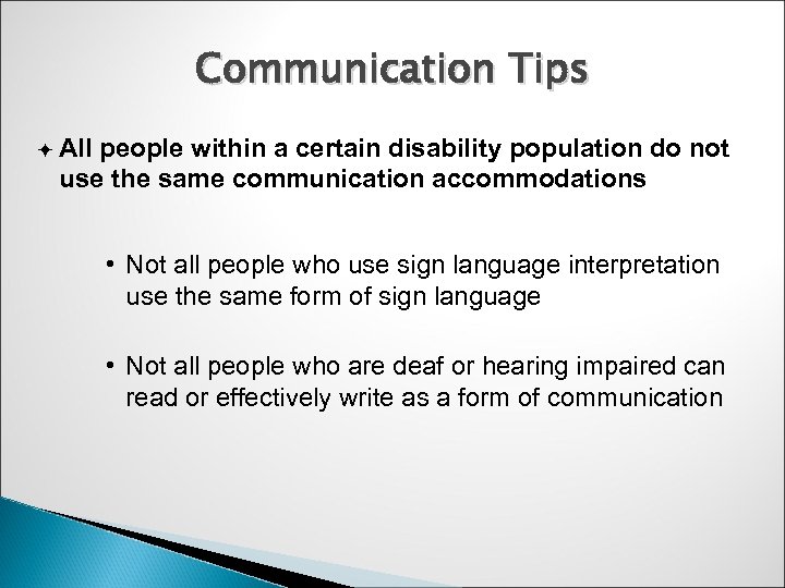 Communication Tips All people within a certain disability population do not use the same communication accommodations • Not all people who use sign language interpretation use the same form of sign language • Not all people who are deaf or hearing impaired can read or effectively write as a form of communication
