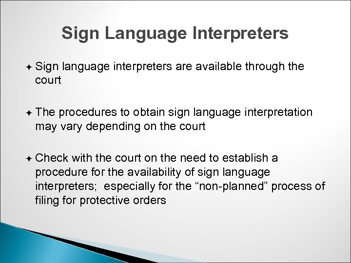 Sign Language Interpreters Sign language interpreters are available through the court The procedures to obtain sign language interpretation may vary depending on the court Check with the court on the need to establish a procedure for the availability of sign language interpreters; especially for the “non-planned” process of filing for protective orders