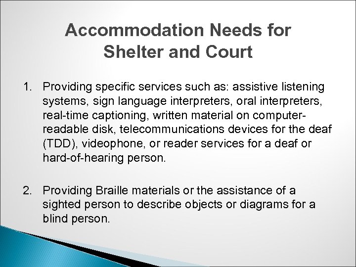 Accommodation Needs for Shelter and Court 1. Providing specific services such as: assistive listening systems, sign language interpreters, oral interpreters, real-time captioning, written material on computerreadable disk, telecommunications devices for the deaf (TDD), videophone, or reader services for a deaf or hard-of-hearing person. 2. Providing Braille materials or the assistance of a sighted person to describe objects or diagrams for a blind person.