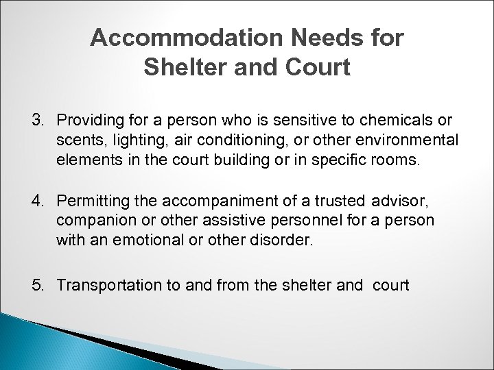 Accommodation Needs for Shelter and Court 3. Providing for a person who is sensitive to chemicals or scents, lighting, air conditioning, or other environmental elements in the court building or in specific rooms. 4. Permitting the accompaniment of a trusted advisor, companion or other assistive personnel for a person with an emotional or other disorder. 5. Transportation to and from the shelter and court