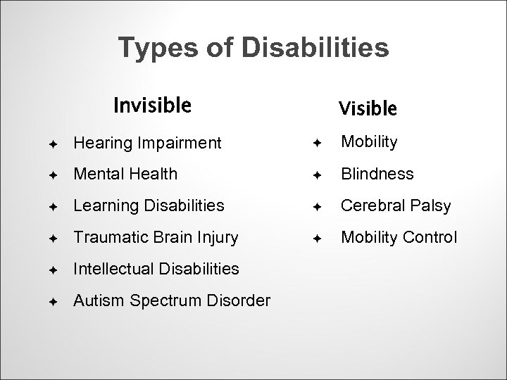 Types of Disabilities Invisible Visible Hearing Impairment Mobility Mental Health Blindness Learning Disabilities Cerebral Palsy Traumatic Brain Injury Mobility Control Intellectual Disabilities Autism Spectrum Disorder