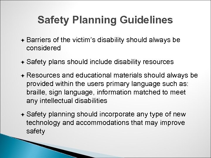 Safety Planning Guidelines Barriers of the victim’s disability should always be considered Safety plans should include disability resources Resources and educational materials should always be provided within the users primary language such as: braille, sign language, information matched to meet any intellectual disabilities Safety planning should incorporate any type of new technology and accommodations that may improve safety