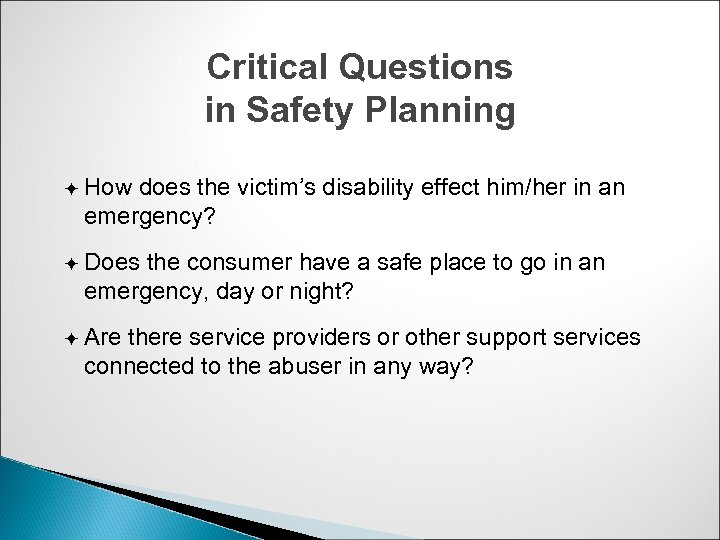 Critical Questions in Safety Planning How does the victim’s disability effect him/her in an emergency? Does the consumer have a safe place to go in an emergency, day or night? Are there service providers or other support services connected to the abuser in any way?