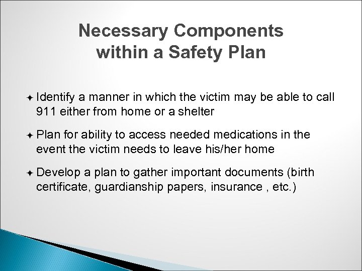 Necessary Components within a Safety Plan Identify a manner in which the victim may be able to call 911 either from home or a shelter Plan for ability to access needed medications in the event the victim needs to leave his/her home Develop a plan to gather important documents (birth certificate, guardianship papers, insurance , etc. )