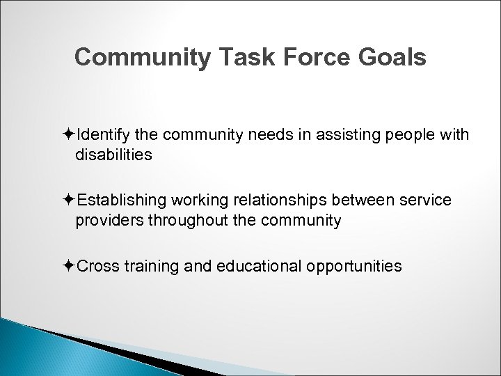 Community Task Force Goals Identify the community needs in assisting people with disabilities Establishing working relationships between service providers throughout the community Cross training and educational opportunities