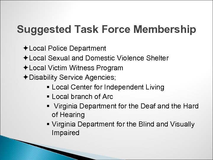 Suggested Task Force Membership Local Police Department Local Sexual and Domestic Violence Shelter Local Victim Witness Program Disability Service Agencies; § Local Center for Independent Living § Local branch of Arc § Virginia Department for the Deaf and the Hard of Hearing § Virginia Department for the Blind and Visually Impaired