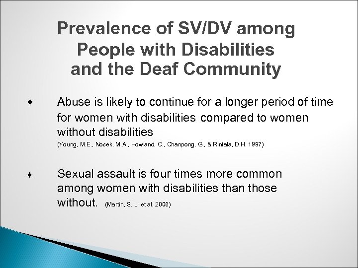 Prevalence of SV/DV among People with Disabilities and the Deaf Community Abuse is likely to continue for a longer period of time for women with disabilities compared to women without disabilities (Young, M. E. , Nosek, M. A. , Howland, C. , Chanpong, G. , & Rintala, D. H. 1997) Sexual assault is four times more common among women with disabilities than those without. (Martin, S. L. et al, 2006)