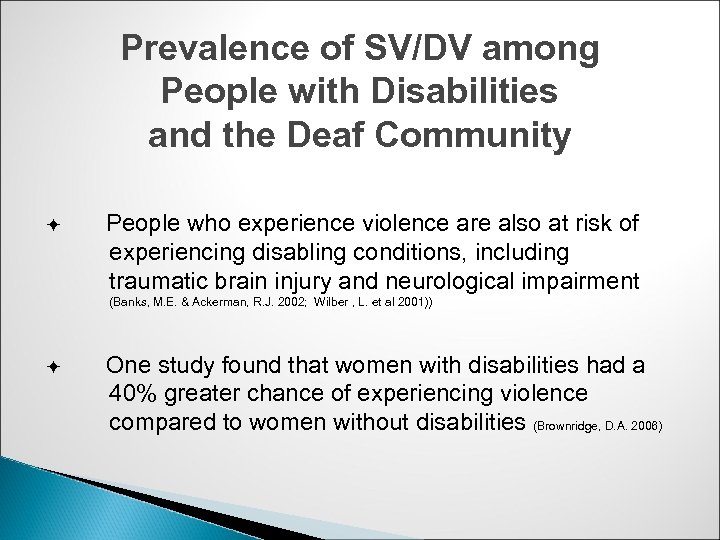 Prevalence of SV/DV among People with Disabilities and the Deaf Community People who experience violence are also at risk of experiencing disabling conditions, including traumatic brain injury and neurological impairment (Banks, M. E. & Ackerman, R. J. 2002; Wilber , L. et al 2001)) One study found that women with disabilities had a 40% greater chance of experiencing violence compared to women without disabilities (Brownridge, D. A. 2006)