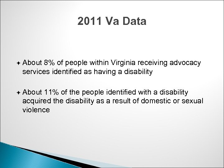 2011 Va Data About 8% of people within Virginia receiving advocacy services identified as having a disability About 11% of the people identified with a disability acquired the disability as a result of domestic or sexual violence