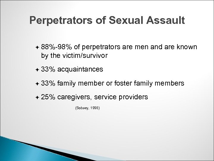 Perpetrators of Sexual Assault 88%-98% of perpetrators are men and are known by the victim/survivor 33% acquaintances 33% family member or foster family members 25% caregivers, service providers (Sobsey, 1998)