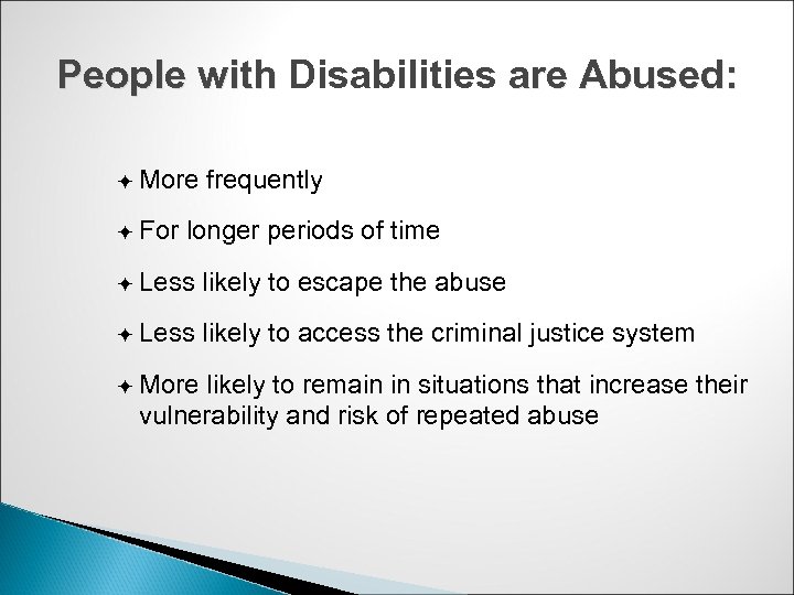 People with Disabilities are Abused: More frequently For longer periods of time Less likely to escape the abuse Less likely to access the criminal justice system More likely to remain in situations that increase their vulnerability and risk of repeated abuse