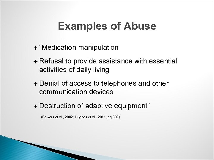 Examples of Abuse “Medication manipulation Refusal to provide assistance with essential activities of daily living Denial of access to telephones and other communication devices Destruction of adaptive equipment” (Powers et al. , 2002; Hughes et al. , 2011, pg. 302).
