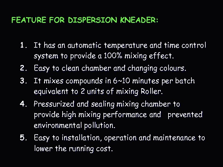 FEATURE FOR DISPERSION KNEADER: 1. It has an automatic temperature and time control system to provide a 100% mixing effect. 2. Easy to clean chamber and changing colours. 3. It mixes compounds in 6~10 minutes per batch equivalent to 2 units of mixing Roller. 4. Pressurized and sealing mixing chamber to provide high mixing performance and prevented environmental pollution. 5. Easy to installation, operation and maintenance to lower the running cost.