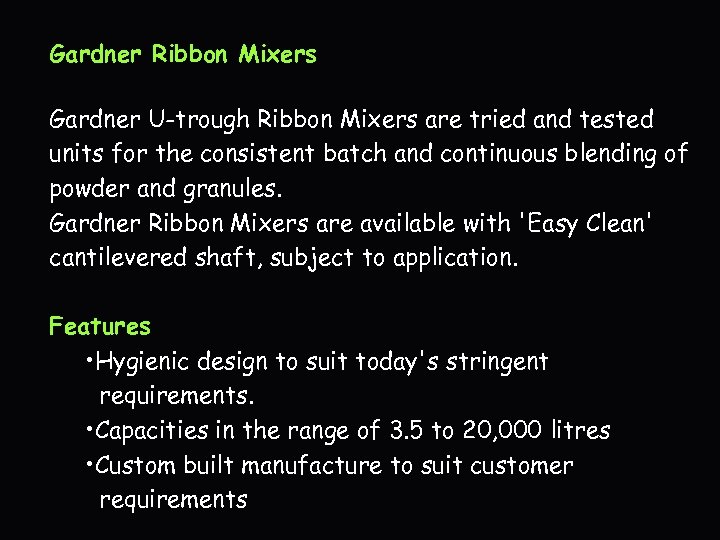 Gardner Ribbon Mixers Gardner U-trough Ribbon Mixers are tried and tested units for the consistent batch and continuous blending of powder and granules. Gardner Ribbon Mixers are available with 'Easy Clean' cantilevered shaft, subject to application. Features • Hygienic design to suit today's stringent requirements. • Capacities in the range of 3. 5 to 20, 000 litres • Custom built manufacture to suit customer requirements