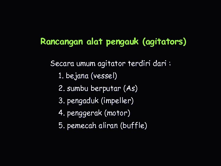 Rancangan alat pengauk (agitators) Secara umum agitator terdiri dari : 1. bejana (vessel) 2. sumbu berputar (As) 3. pengaduk (impeller) 4. penggerak (motor) 5. pemecah aliran (buffle)